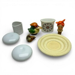 | Omschrijving | Lot divers porselein, waaronder een Hutschenreuter dekseldoosje met vergulde details, een porseleinen beeldje van een vis, gemerkt KPM, een design peper en zout stel van Rosenthal, Fürstenberg schaaltje met decor van vogel, Clarence Cliff melkkannetje en schoteltje en drie stuks glaswerk, waaronder een oranje vaas. |