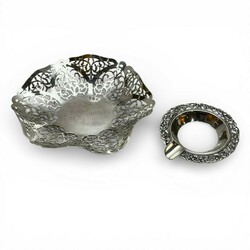 | Omschrijving | Lot divers zilver en verzilverd, waaronder een gehamerd derde gehalte (800/1000) djokjazilveren asbakje, een verzilverd schaaltje en verzilverde rammelaar, en vier potjes met eerste gehalte (925/1000) zilveren deksels. |