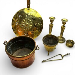| Omschrijving | Lot koper en messing: ketel op ijzeren komfoor, in gekuipte stoofemmer, beddenpan, wandkandelaar, paar kandelaars met classicistisch reliëfdecor, inktpotje, dekseldoosje, etc. |