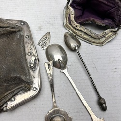 | Omschrijving | Lot met diverse artikelen met 2e gehalte (835/1000) zilveren applicaties. Bestaande uit twee beursjes, strooiers, lepelvaasje met lepeltjes. |