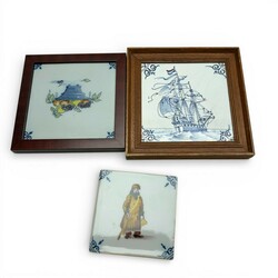 | Omschrijving | Lot van elf 20e eeuwse tegels, gedeeltelijk gelijst. Diverse voorstellingen, waaronder een molen, Tichelaar Makkum, rokende indiaan, schepentegel en enkele kleinere tegeltjes. |