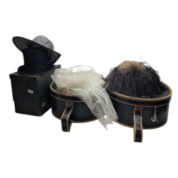 | Conditie | Lichtgrijze hoed/bruin wollen hoed: goede staat; bruidshoed: heel licht verkleurd; herenhoed: goede staat, verder kartonnen doos beschadigd, en één hoedendoos defect bij sluiting |