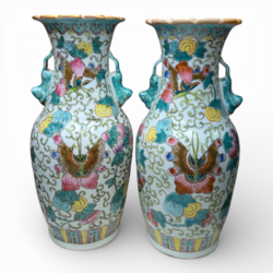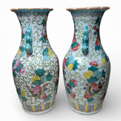 | Omschrijving | Lot van twee 20e eeuwse Chinees porseleinen vazen, balustervormig model, met Famille Rose beschildering van bloemen en grepen, twee oren in de vorm van dierfiguren, aan de bovenzijde met geschulpte rand, aan de onderzijde gemerkt met zegelmerk. |