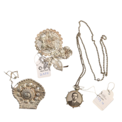 | Omschrijving | Twee 2e (835/1000) en 3e (800/1000) gehalte zilveren broches in de vorm van een Indische filigrain bloem en een Friese oorijzer knop. Hierbij een zilveren medaillon met foto´s aan een zilveren collier. Totaal 31,92 gram. |