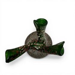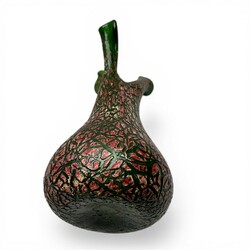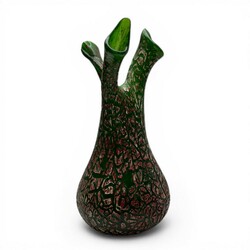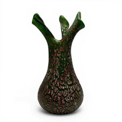 | Omschrijving | Een jugendstil/art nouveau groen glazen met rood/witte craquelé vaas met drie tuiten. Boheems, mogelijk Kralik of Pallme-Köning, Vroeg 20e eeuws. |