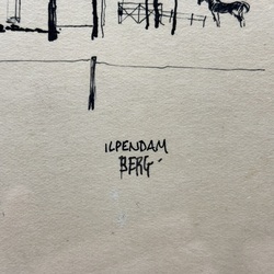 | Omschrijving | Inkttekening op papier, voorstelling van een boerderij, titel 'Ilpendam'. Rechtsonder gesigneerd Will Berg (Arnhem 1921-2001), gedateerd 1938. |