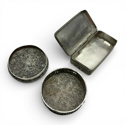 | Omschrijving | Lot van twee zilveren doosjes: een 19e of 20e eeuws rond filigrain doosje met florale motieven. Aan de binnenzijde gemerkt met belastingkeur 'V'. Met daarbij een antiek 19e eeuws tweede gehalte (835/1000) Nederlands zilveren snuifdoosje, gegraveerd. Aan de binnenzijde gemerkt met jaarletter E (1864) en onduidelijk meesterteken. |