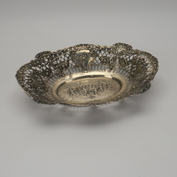 | Omschrijving | Een derde gehalte (800/1000) rijk bewerkte zilveren broodmand. Opengewerkte randen, versierd met guirlandes en bloemenmanden. In het midden een voorstelling van putti’s in een landschap. |