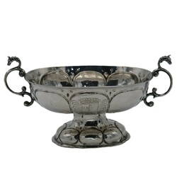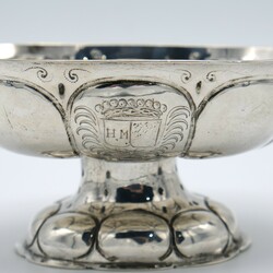 | Omschrijving | Een 17e eeuwse Groninger gelobte brandewijnkom met heraldisch wapen en initialen HM. Gemerkt 3N (jaarletter voor 1666-1667) en meesterteken M (Jan Mettinck, werkzaam van 1655 tot ca. 1671). Afkomstig uit de familie Meyering |