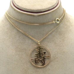 | Omschrijving | Een achttien karaats (750/1000) Chinees geelgouden hanger, ‘shou’, karaktersymbool voor lange levensduur. Aan collier |