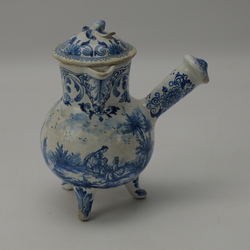 | Omschrijving | Een 19 eeuws Frans aardewerk chocolade kannetje op drie voetjes. Weens model. Blauw/wit en rondom met landschap beschilderd. Met op de achterzijde een familie wapen. Gemerkt op de onderzijde met een Roos. Naar een 18e eeuws Delfts aardewerk voorbeeld fabriek de Roos ten tijde van Dirck van der Does (1755-1770). |