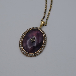 | Omschrijving | Een 14 karaats (585/1000) geelgouden collier, met daaraan een 9 karaats (375/1000) bwg gouden hanger met een grote paarse amethist, in het midden bezet met vier diamantjes en rondom bezet met parels. Gemerkt WJ |