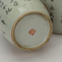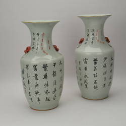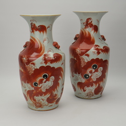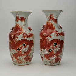 | Omschrijving | Twee 19e eeuwse Chinees porseleinen vazen met ijzerrood decor van Boeddhistische leeuwen. Op de achterzijde Chinese tekens. |