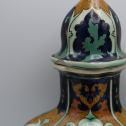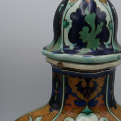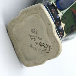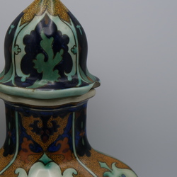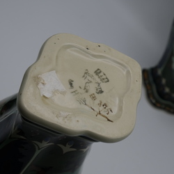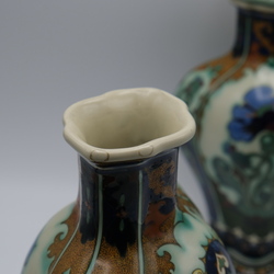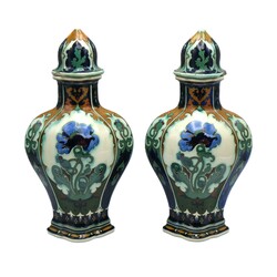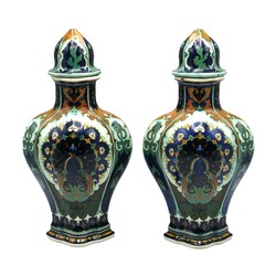 | Omschrijving | Een set platelen vazen met deksels, gemerkt Rozenburg Den Haag. Voorstelling van pauwen en bloemen. gemerkt met blindmerk en werkordernummer 375 |