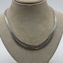| Omschrijving | 14 karaats witgouden gevlochten damescollier, bezet met vijf robijntjes. |