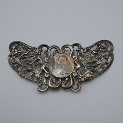 | Omschrijving | Een antieke eerste gehalte zilveren art nouveau verpleegstersspeld. Floraal versierd en buste van vrouw in het midden. Gemerkt (R&W) voor Reynolds & Westwood, Birmingham 1905 |