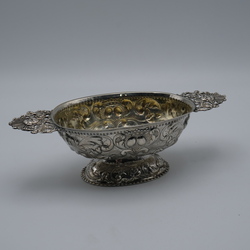 | Omschrijving | 18e eeuwse zilveren brandewijnkom versierd met drijfwerk van acanthusbladeren. Sneek 1738. |
