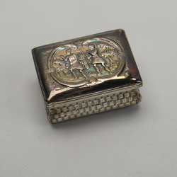 | Omschrijving | Een antiek laat 18e of vroeg 19e eeuws Nederland zilveren snuifdoosje. Mandvormig, met op de voorkant een religieuze voorstelling van het Beloofde Land: twee mannen die een druiventros tillen. Op de onderkant een jachtvoorstelling. Onduidelijk gekeurd. |