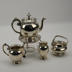 | Omschrijving | Een tweede gehalte (835/1000) Nederlands zilveren vijfdelig theeservies, bestaande uit theepot, melkkan, suikerpot, lepelvaas en komfoor. Allen versierd met opengewerkte rand en parelrand. Vier objecten gemerkt Van Kempen. Suikerpot gemerkt Mr. A. Presburg, Haarlem, |